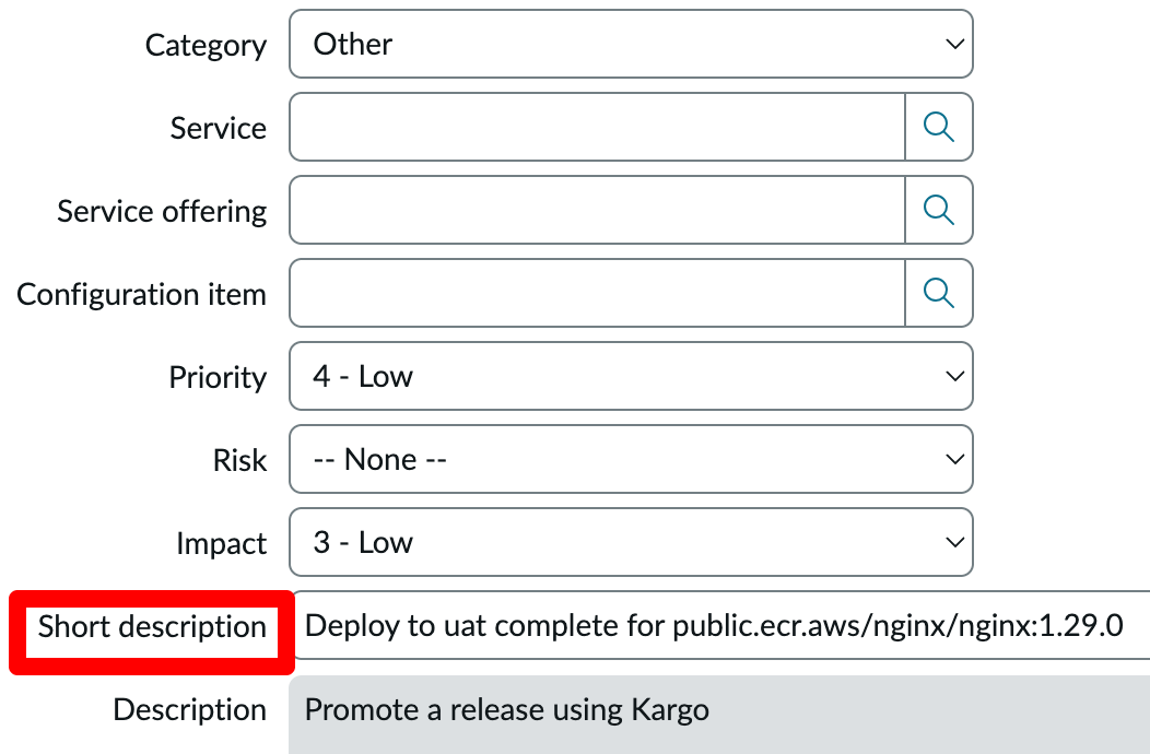 Most of the time you cannot use the field labels you see in the ServiceNow UI as keys in the step configuration. For example, if you want to set the value for the “Short description” field: